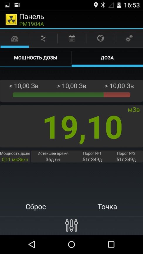 • Отображение результатов измерений в различных единицах (Зиверты, Рентгены)