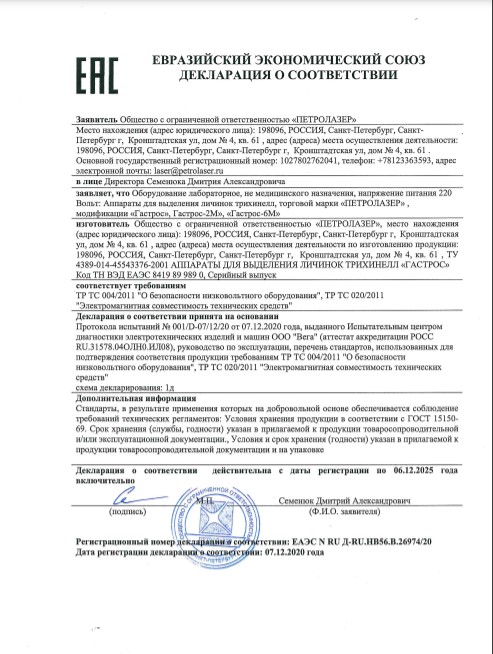 Аппарат для выделения личинок трихинелл «Гастрос — 6М» — предназначен для выделения личинок трихинелл методом группового переваривания в искусственном желудочном соке. Аппарат реализует методику исследования на трихинеллез, утвержденную Департаментом Ветеринарии.
