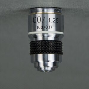• 100х/1,25 подпружиненный (МИ - масляная иммерсия), с покровным стеклом 0,17 мм.