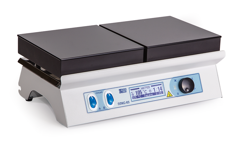 Плита нагревательная лабораторная секционная ПЛКС-03 имеет две секции нагрева. Каждая секция нагрева может работать отдельно или совместно. При совместной работе секций температура разогрева одинакова по всей нагревательной поверхности обеих секций.