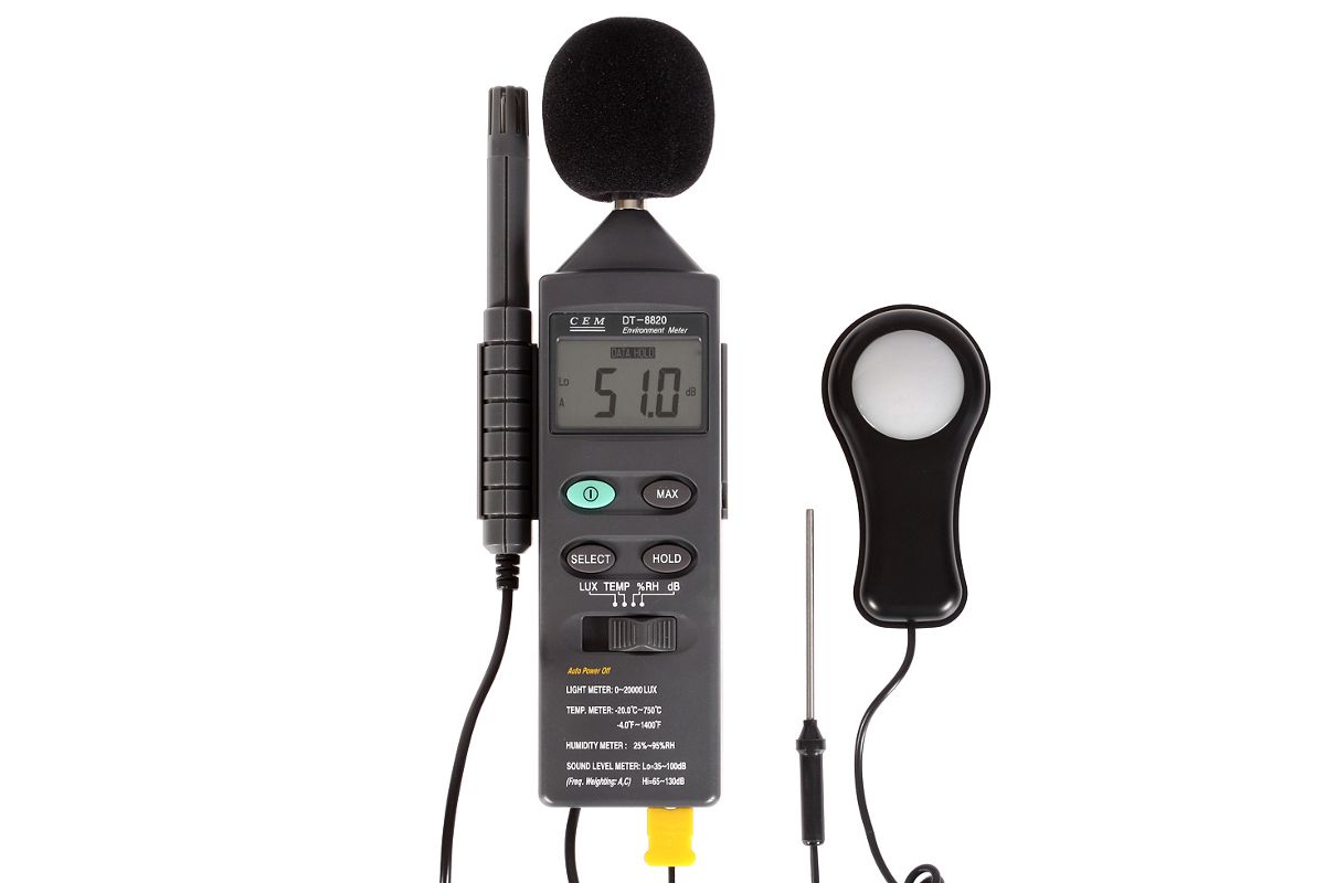 Функции термометра, гигрометра, люксметра и шумомера реализуются в CEM DT-8820 с помощью специальных датчиков, соединённых с единым цифровым блоком.