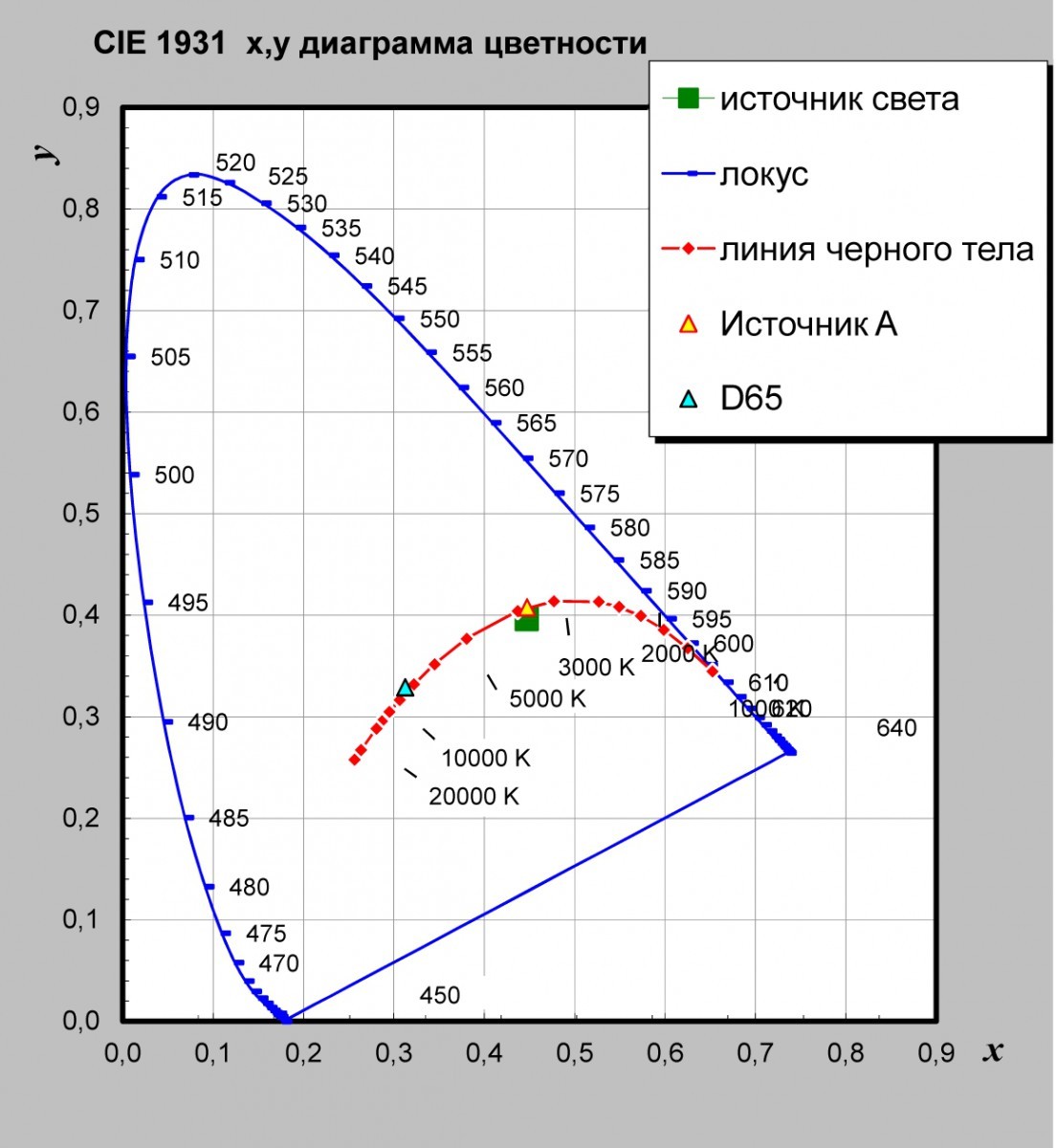 1 Отображение освещённости Е, лк и координат цветности (x, y) в системе МКО 31
