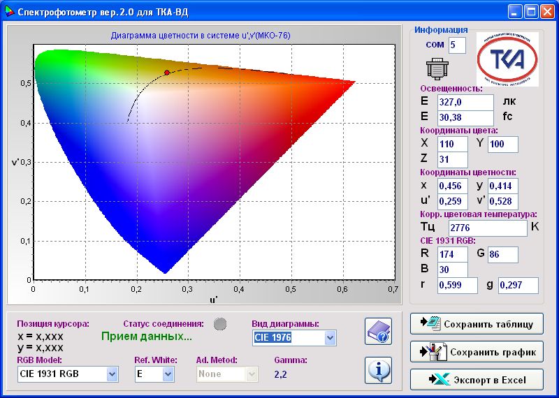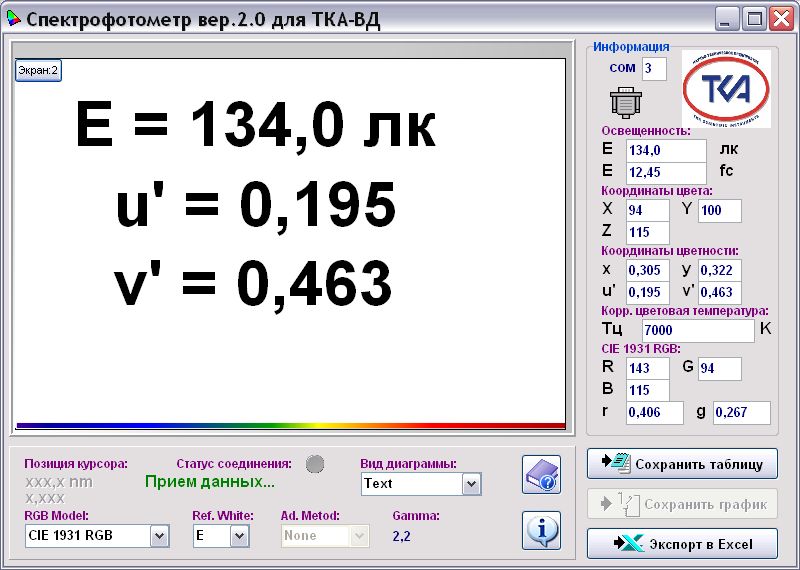 2 Отображение освещённости Е, лк и координат цветности (u’, v’) в системе МКО 76