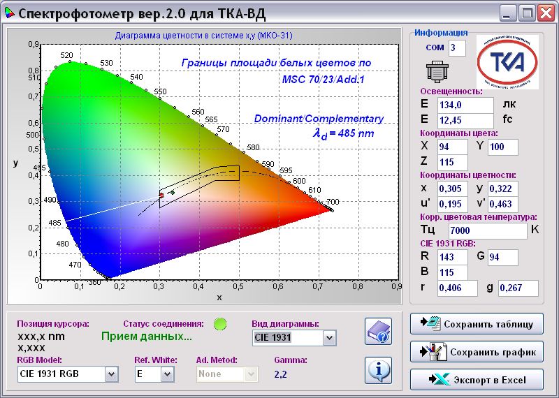 1 Отображение освещённости Е, лк и координат цветности (x, y) в системе МКО 31