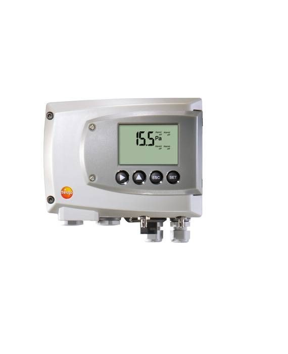 testo 6351 трансмиттер дифференциального давления с функцией расчета скорости потока, погрешность ±0.8% от измеряемого диапазона, автоматическая настройка «нулевой точки», возможность выбора измерительных диапазонов от 50 Па до 2000 гПа, возможность выбора сигнальных аналоговых выходов, внешний цифровой интерфейс для настройки и параметризации, опциональный дисплей, вывод данных во всех единицах измерения давления и скорости потока