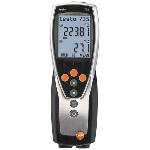 testo 735-2, 3-х канальный прибор измерения температуры (термопары Типов K/T/J/S/Pt100), с акустическим сигналом тревоги, памятью для сохранения данных, ПО для ПК и USB кабелем для передачи данных, батарейкой и заводским протоколом калибровки