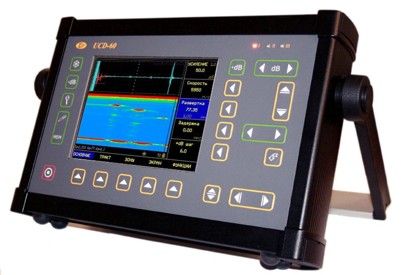 Универсальный ультразвуковой дефектоскоп УСД-60 с полноцветным TFT дисплеем 135 х 100 мм отображает сигналы в виде А, B, C -сканов, имеется возможность записи и хранения большого объем данных, автоформирование отчетов и генерация протоколов с возможностью  вывода их на печать непосредственно с дефектоскопа. Дефектоскоп УСД-60 применяется так же для замера толщины изделий с высокой точностью и коррекцией V-образности поверхности объекта, способен проводить ручную, автоматизированную контактную и иммерсионную (специальная и-зона) диагностику. К дефектоскопу УСД-60 подключаются многоканальные скан-системы (до 32-х каналов). Ультразвуковой дефектоскоп УСД-60 сертифицирован и внесен в реестр СИ (№34808-07). Гарантия на дефектоскоп составляет 36 месяцев (3 года).