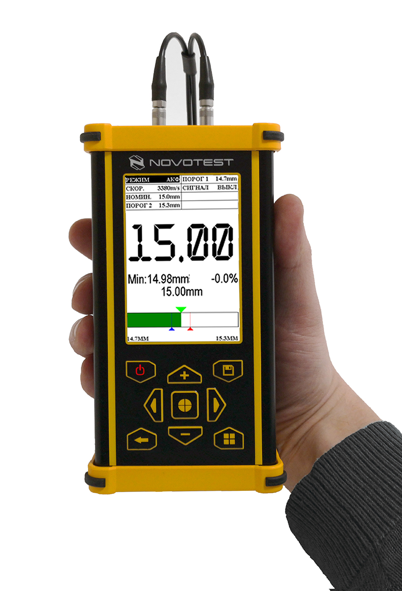 Высокая точность контроля толщины достигается за счет реализации метода измерения по переходу сигнала через ноль, исключающего влияние настроек усиления. Наличие высокопроизводительной вычислительной микросхемы ПЛИС обеспечивает высокое разрешение по толщине без снижения скорости и стабильности работы прибора.