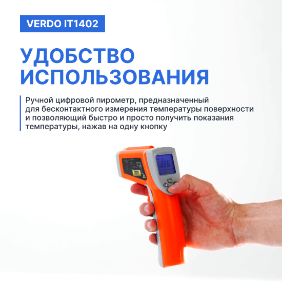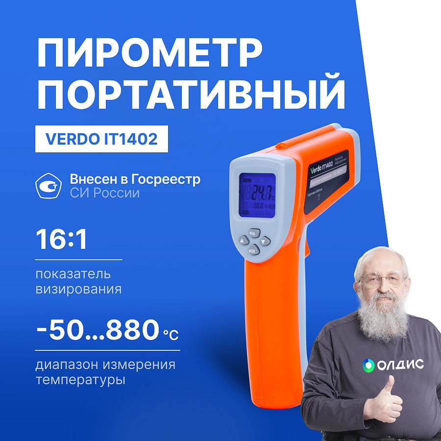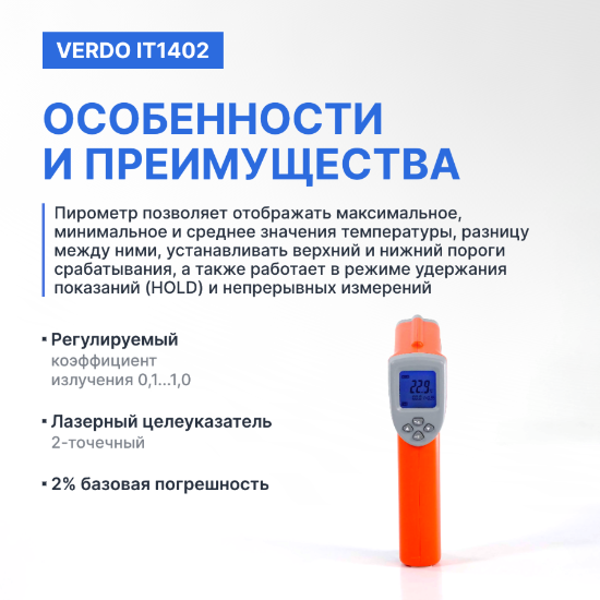 Инфракрасный пирометр Verdo IT1402 бесконтактный измерительный прибор, предназначенный для быстрого и точного определения температуры поверхности различных объектов. Он использует инфракрасную технологию для обнаружения и анализа инфракрасного излучения, испускаемого объектом, и преобразует его в электрические сигналы для отображения температуры на цифровом дисплее. Прибор оснащен жидкокристаллическим дисплеем с подсветкой, позволяющим считывать показания в условиях различной освещенности. Применение инфракрасного пирометра целесообразно в различных отраслях промышленности, включая металлургию, машиностроение, энергетику и HVAC-системы. Прибор также находит широкое применение в лабораторных исследованиях, строительстве и коммунальном хозяйстве.