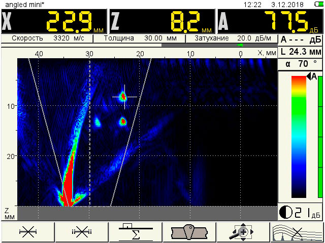 Обеспечивает работу прибора в качестве классического дефектоскопа с наклонными и прямыми преобразователями. При этом сигналы выводятся на экран в виде А-Скана.